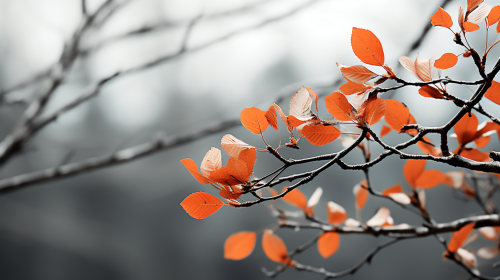 asheville North Carolina. Fall. Autumn. Neon minimalist. Peak leaves. Extreme low angle shot. Worm’s eye view.Black and white photograph with vibrant autumn color splash. High-end. Stylish. Important. Mysterious. Black and white. Shot with a Pentax. K-3 III Monochrome. --ar 16:9 --q 0.5 --s 750