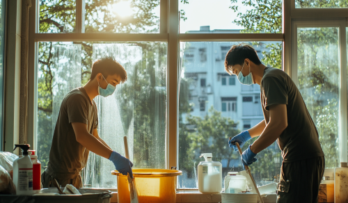 Two Asian men cleaning windows. Both are wearing masks and gloves, working carefully. Cleaning tools like buckets, mops, and spray bottles are placed around them. The men are focused on wiping the windows, with sunlight shining through the glass. The surrounding area is neat, with cleaning supplies scattered nearby --ar 12:7