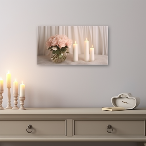 an interior photo of a home altar; flowers and candles; in the center a photo frame; minimal interior design; Hyperrealistic. --ar 16:9 --style raw --v 6.0