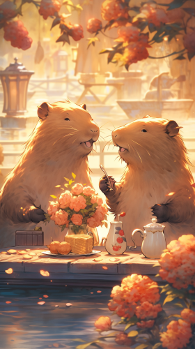 Imagine two adorable capybaras indulging in their cozy tea time. How do they savor the aroma of tea and each other's company. Artistic light, photorealism --ar 9:16 --niji 5 --s 200 --c 5