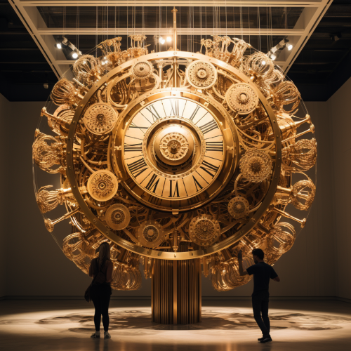 20 feet in diameter, magical device that tells time, fortune and the future, art deco elements, all gold metal, complicated, gears, moving parts horizontal and vertical, very small golden scales surround the structure, in the style of Thomas Heatherwick and Victor Horta
