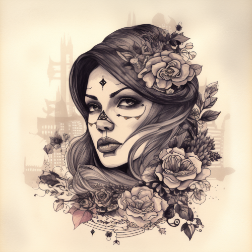 korean girl with flowers and small butterfly black tattoos, half body, beutiful, tattoos are fineline and beutiful, winter theme, no tatoo on face, entire head