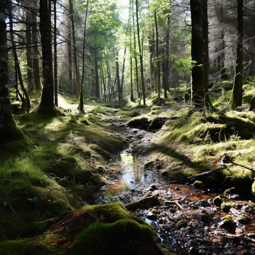 Prompt:** Ein ruhiger Wald im Morgenlicht, sanfte Sonnenstrahlen brechen durch das dichte Blätterdach, der Boden ist mit Moos bedeckt, ein glasklarer Bach fließt ruhig im Vordergrund, im Hintergrund stehen kraftvolle, hohe Bäume, die in den Himmel ragen, die Szene strahlt Frieden, Stärke und Gelassenheit aus. --s 750