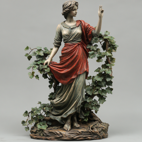A grey stone statue, full body view, standing, right hand raised, slender, wearing a red scarf, body entwined with green plants, beautiful legs, dynamic angle, profile view, green ivy winding around the legs --s 750
