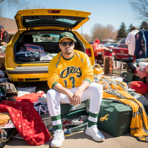 Extremely fashionable packers fan wearing solid baseball cap, intimidating people at a yard sale at tailgate party