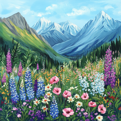 Majestic mountains in the background with a sprawling flower field in the foreground, featuring alpine flowers such as lupines, wild roses, and edelweiss. Style: Create texture in the mountains with bold brushstrokes and detail the floral field with rich, vibrant colors. Use a cool color palette for the mountains and a warmer one for the flowers.