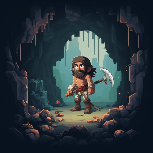 pixel art, cute, a caveman carrying a spear leaving his cave, style of cave story --ar 1:1