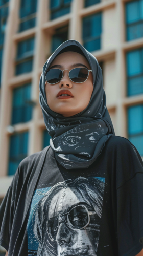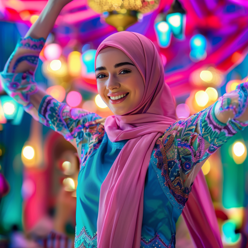 A realistic and colorful portrait of a beautiful, fit woman in athletic gear and a hijab, taking a break from her workout to enjoy iftar during Ramadan. Her smile is warm and inviting, set against a backdrop of a beautifully decorated room with Ramadan lanterns. Created Using: vivid colors, dynamic lighting, cultural integration, festive atmosphere, authentic Ramadan decorations, joyous expressions, hd quality, natural look --ar 3:4 --v 6.0