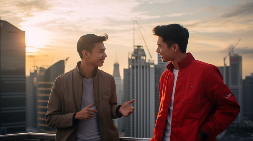 two young indonesianbusinessman wearing red shirt is talking on a rooftop, skyline view, skyscrapers, sunset, taken with Canon EOS 5D Mark IV DSLR camera, using an EF 50mm f/ 1. 8 STM lens. The resolution should be 30. 4 megapixels, with an ISO sensitivity of 32, 000, and a shutter speed of 1/ 125 second. Photorealistic and ultra detailed. The lighting should be warm and bright, The colors should be vibrant and rich --v 5.2 --ar 16:9