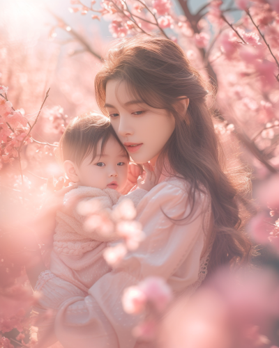 Cinematic, High quality photograph, extremely extremely beautiful young mother joyfully holding new baby in the vibrant sunlight, both mom and baby wearing clothes with pink color, pink pastel mood, photo-real, hyper-realistic, highly detailed, taken with a sony a1 camera, --ar 4:5 --v 6.0