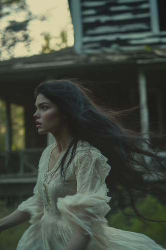 In the foreground, slightly off-center, there is the blurred figure of a woman with long dark hair looking towards the house. She is wearing an antique white dress that gently sways as if moved by the wind. Her face is partially visible, expressing a mix of sadness and determination. The figure might be semi-transparent, suggesting the spectral nature of Teresa, --ar 2:3 --s 50 --v 6.1