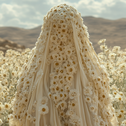 professional picture of an arab woman fully covered by dress made of real white flowers from head to toes and desert in the background, beautiful horizon, oman , professional lighting, professional color, high quality - --v 6.1 --s 750