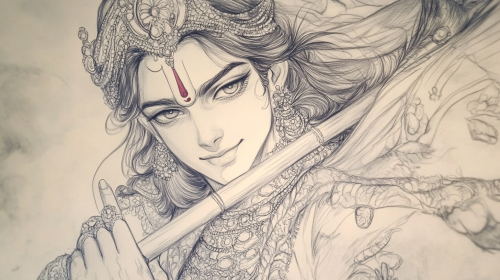 Lord krishna celebrating indian festival janmashtami, indian folk painting style --ar 4:7