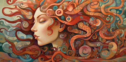 A painting of Medusa, in the style of Matisse, by Amanda Clark and Marjorie Sarnat. Psychedelic swirls, with hair made of seashells, depicts a long, curly, reddish-brown haired woman in a dreamlike style. --ar 39:19 --v 5.0 --s 750