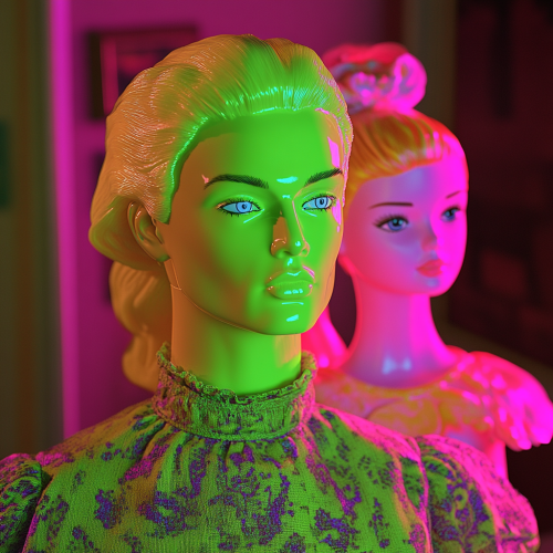 a whimsical toy with a 3D printed color bruce Jenner head on top of a barbie doll body. Marketing vibes. Ambient lighting. Hyper realistic. Pink and lime green vibes. Weird vibes. Surreal. Cinematic.