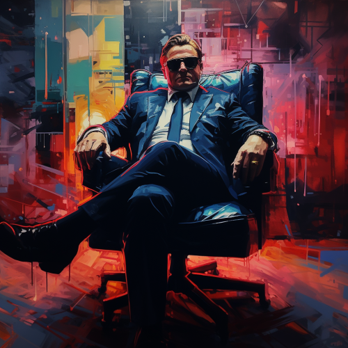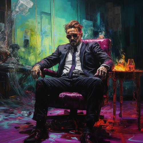 oil paint art by francis bacon, wide angle, psychedelic art, boss of the russian Mob talking buisness, marvel knights style, dramatic vibes, neon lights, cyberpunk vibes,