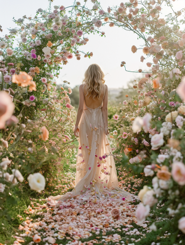 Low angle static shot: The camera is angled at a woman wearing a red dress. She is standing in a garden full of blue flowers. The clear sky is in the background, with warm sunlight shining over her head