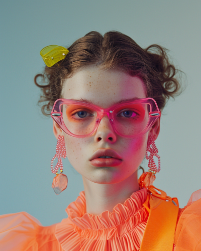 studio shot, frontal still shot, dazed editorial style, a very beautiful Model wears pink candy color pop (pop geometry street style) hyper breathtaking exuberant accessories (eyeglasses, Earrings and other accessories ) she is wearing an outfit by Balenciaga (Unexpected results) clear gray background --ar 4:5 --v 6.0
