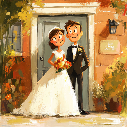 A whimsical illustration of a sweet girl with blushing cheeks. 2 cuckoos, brown hair, big green eyes, a beautiful girlish dress, standing in a wheat field and picking wheat in the background, a small dreamy, beautiful country house with a tree in the garden with purple, red and blue leaves at dusk. A stunning children's book style dreamy illustration