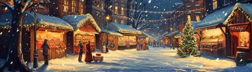 a kid's christmas market, beautiful and colorful, fun, children's illustrated book, painterly style --v 6.0 --ar 21:6