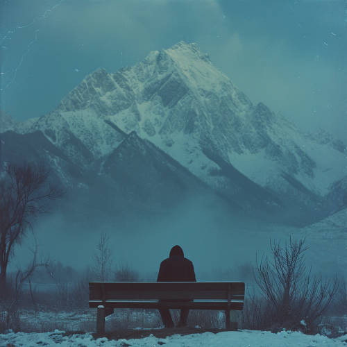 A man sits on a bench in Russia, with a snow-capped mountain behind him, in a chill atmosphere, blue in color. --v 6.0 --stylize 250