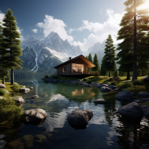 In the style of Carlos Scarpa, architecture, a cabin in the mountains, lake, hyperrealistic, 8k ultra HD, drone view,