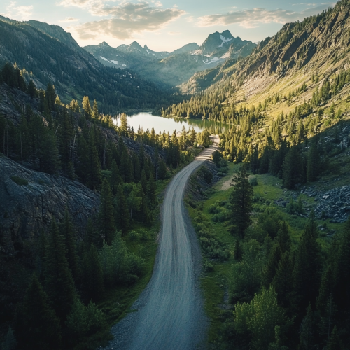 A gravel road with culdesac carved into thick timbered mountains of Idaho, mountain lake in the near distance, high elevation, beautiful scene, perfect lighting, drone view, ultra-realistic