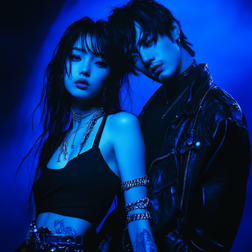 Album cover, full body, A beautiful Japanese hardrock female and a European white hardrock boy holding hands in love, neon blue, ultra realistic, captured with a Sony Alpha A7R IV, lens canon EF24 - 70mm f/ 2. 8 LVSM II, 8k