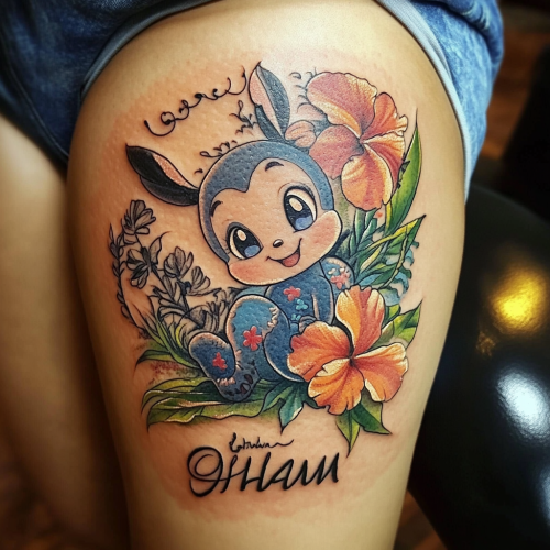 Flawless lilo and stitch inspired tattoo. Include lilo and her older sister Nani and details that exhibit sisterly love and family. Include hawaaiian flowers and the word OHANA.