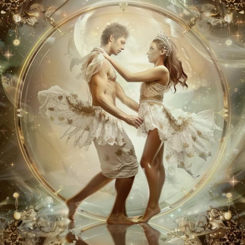 ultra realistic photo, astrology, sacred geometry, beautiful woman as Venus and beautiful man as Mars in fractals of dance, war and love