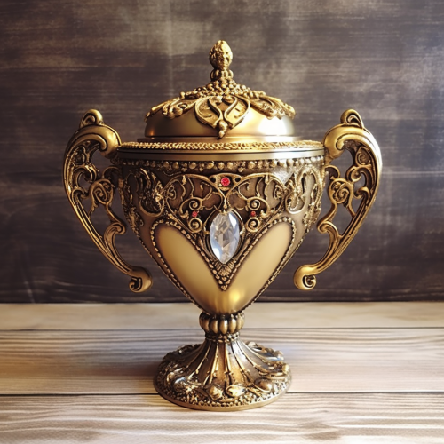 gold love cup chalice with lid and hearts, romance, angel handles, highly detailed, beautiful