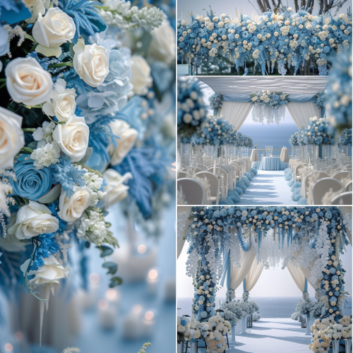 love themed beautiful floral wedding setting, blue and white color scheme --v 6.0