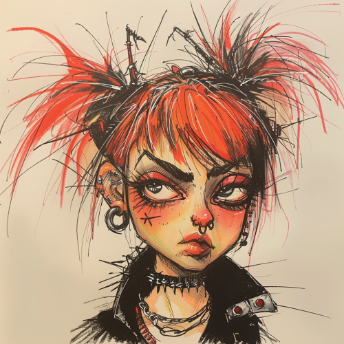 beautiful punk woman, short buzzed red hair, tattoos, heavy eye makeup, full body pose, self - confident, dangerous and evil, deadly and lethal, beautiful makeup, vibrant smile, beautiful and supermodel woman, beautiful proportions with wide round hips, tiny waist, impressive and apparent chest, piercing eyes, high contrast, hyperdetailed, curvaceous body, expression of the body, style of Frank Frazetta, Guilliem March, J Scott Campbell, Michael Turner, and Adam Hughes, decadent picture, --ar 9:16 --chaos 10 --weird 20 --s 250 --niji 5