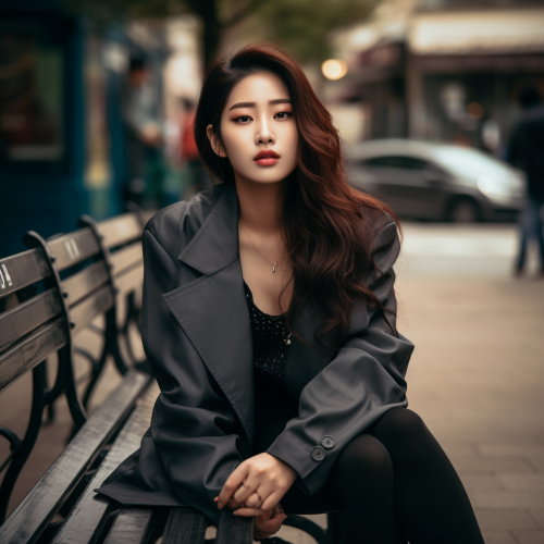 photo of a beautiful tall slim young korean female celebrity, long hair, wearing gloves, blazer, leggings, sitting, street photography
