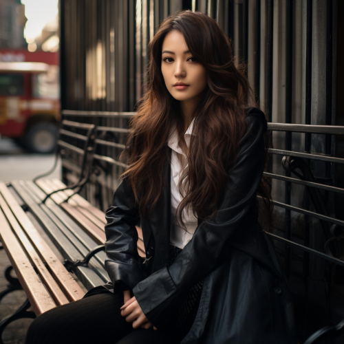 photo of a beautiful tall slim young japanese female celebrity, long hair, wearing gloves, blazer, leggings, sitting, bench, street photography