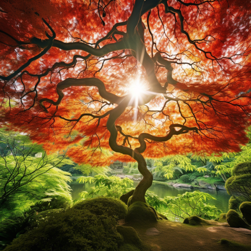 a beautiful japanese maple in spring, close view looking through the branches and leaves with rays of sun shining through the canopy, high detail, photoreal