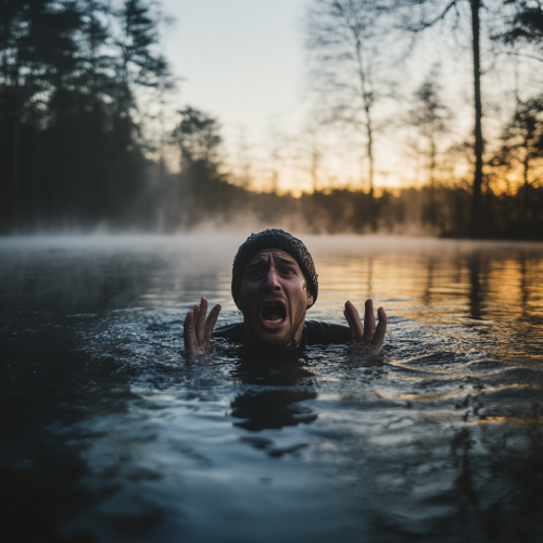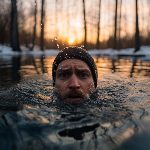 a brisk morning, 1 man is in a lake submerged up to his neck. mid 30s . he's african. he is cold, the water has took his breath away. There is trees in the background and the sun is just rising. The photo is a wide shot taken on a sony a7iV on 14mm lens. he is holding the camera like its a selfie. his facial expression is closing his eyes in pain. it should be hyperrealistic and 8k. he is wearing a beanie