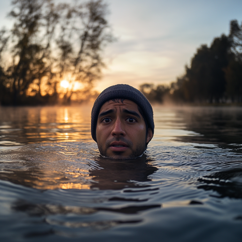 a brisk morning, 1 man is in a lake submerged up to his neck. mid 30s . One hispanic. he is cold, the water has took his breath away. There is trees in the background and the sun is just rising. The photo is a wide shot taken on a sony a7iV on 14mm lens. he is holding the camera like its a selfie. He looks shocked. it should be hyperrealistic and 8k. he is wearing a beanie