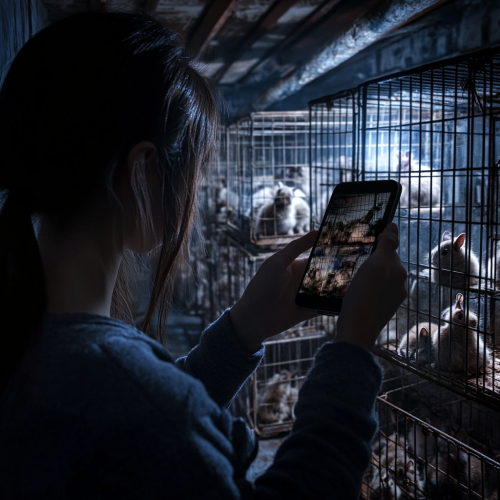 a teenage girl holding a cell phone that shows a picture of a room that has cages in it with small, round chinchillas in it that are in dim lighting and look like poor conditions