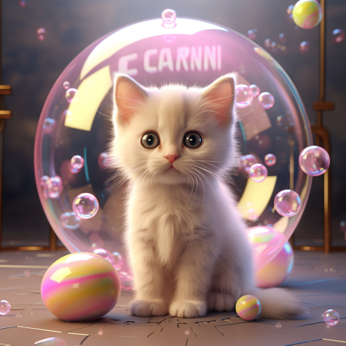 3D,4K, a cute white kitten with blue eyes wearing a golden crown inside a transparent bubble. The kitten is surrounded by a series of pink and yellow hearts and stars both inside and outside the bubble. The name "CBN" in stylized pink letters is prominently displayed in front of the kitten. The background is light gray, highlighting the vibrant colors of the foreground elements. There are lots of little pink hearts at the bottom of the photo