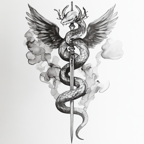 An ink wash illustration of a caduceus, featuring two serpents entwined around a central staff with wings at the top. The serpents' bodies curve gracefully around the staff, with fluid, organic lines inspired by traditional East Asian ink painting. The wings are delicate and lightly detailed, symbolizing balance and healing. The entire composition is in black and white, with slight variations in line thickness to create a hand-drawn, harmonious, and symbolic look.