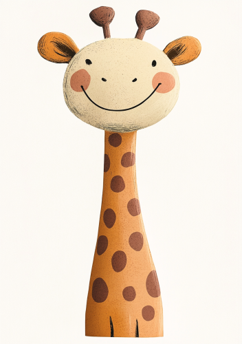 A cute giraffe toy clipart, on a white background, in the style of Jon Klassen and Oliver Jeffers; warm color palette with pastel tones; minimalistic design; large head and small body. The animal is standing upright with its neck straightened back. It has brown spots on the fur that resemble dots. A smile can be seen at one end of its long tongue, which appears to have three visible branches. --ar 7:10