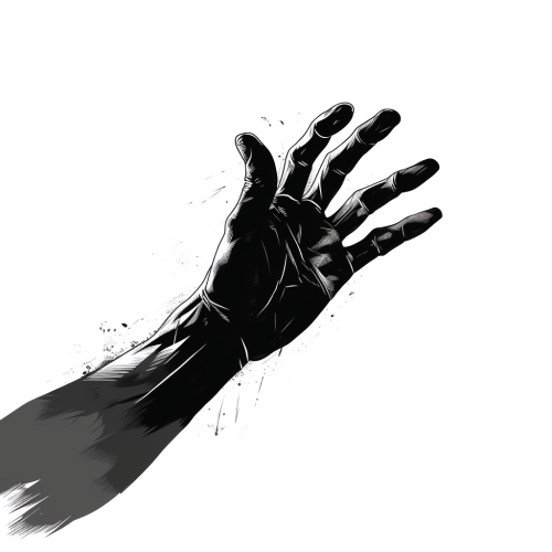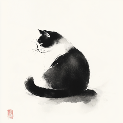 An ink wash illustration of a cat in a relaxed, seated pose. The cat's form is minimalist, with soft, flowing lines that suggest its graceful shape without detailed features. The brush strokes are smooth yet slightly varied in thickness, capturing the essence of traditional East Asian ink painting. Black and white, with an emphasis on simplicity and elegance, giving the cat a calm, contemplative presence.