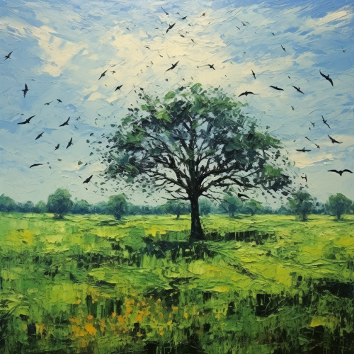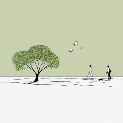 A line drawing of a man walking toward a large tree with white fruit on it, a river runs nearby in one-line drawing, octane render, figure outline only, single line, simple, in the style of one-line, single line drawing, black line, browns and greens, whites, clean lines, minimalistic, simple, Picasso one line drawing war and peace style