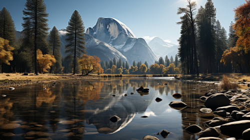 Landscape Photography. Ansel Adams. Captured with a large format 8x10 view camera, using Kodak Tri-X Pan film. Majestic view of Half Dome and the Merced River. 210mm lens at f/32. Stark contrasts, granite cliffs illuminated by golden hour light. --ar 16:9 --s 750