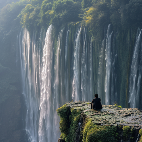A chinese man is sitting on the edge of acliff watching a waterfall, in the styleof 32k uhd, kinetic art,Drone view, ultrawide Angle lenshigh-saturation colorNational Geographic photo, in the style ofethereal landscape, 8k resolution,, giganticscale, time-lapse photography.contemporary chinese art, grittyreportage ar 3:2 --v 6.0