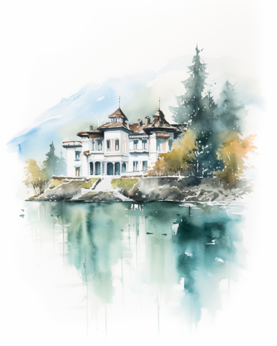 quick minimalist watercolor sketch, expressive, a italian mansion near lake Como, blue tones with dark green and rust accents, isolated on white background --ar 4:5