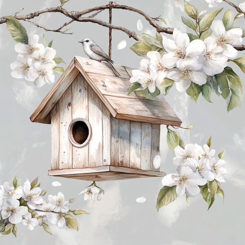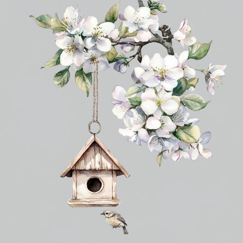 highly detailed watercolor clipart of a beautiful birdhouse, hanging on a blossoming tree branch, white blooming flowers, a touch of spring, naturally composed composition, soft colors, luxurious aesthetics, beautiful illustration with realistic details, high resolution, gray background