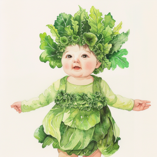 watercolor, chubby cute baby with cabbage dress and broccoli crown --s 50 --v 6.0