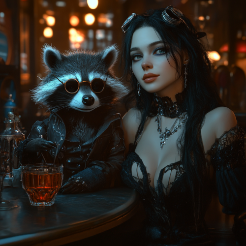 Hyper photo realistic and cinematic looking, Anya Taylor Joy with long black hair in a cabaret outfit, sitting at a cabaret style bar and talking with a raccoon dressed in nerdy clothes wearing reading glasses